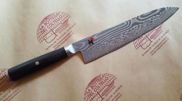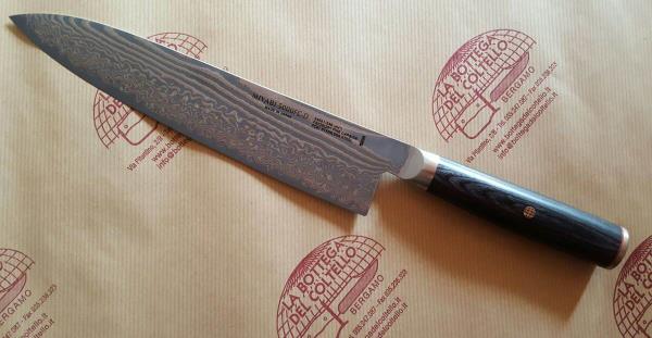 Modello Gyutoh, più noto in Italia come trinciante, codice 34681-241, lama da 240 mm. Design damascato a 49 strati, cuore in acciaio FC 61. Impugnatura in pakkawood. Confezione: scatola di plastica e cartoncino. No lavastoviglie!
