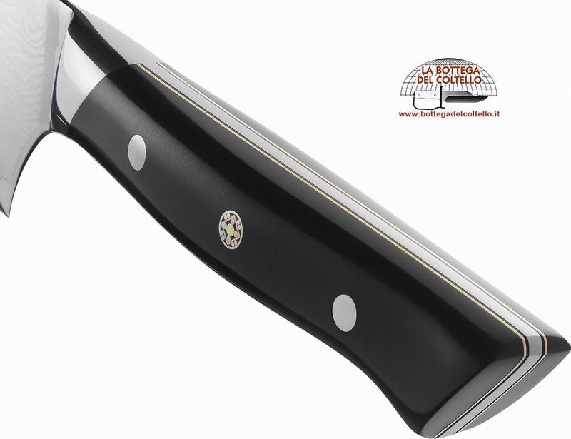 Lame affilate come bisturi, belle ed eccezionalmente resistenti, costituite da 133 strati di acciaio; quello centrale extra-duro, che si conclude nel tagliente, è in metallurgia delle polveri. L'impugnatura in materiale sintetico lucido, con un funzionale design occidentale, garantisce una perfetta ergonomia. Un grazioso logo e una calda linea gialla sull'impugnatura rivettata sottolineano il fascino dei coltelli.