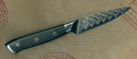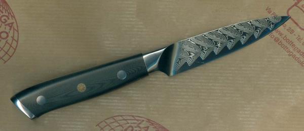 DTYT SWITYF Spelucchino per vegetali - Lama in damasco piuma 67 strati, al cuore acciaio AUS-10V. Manico in G-10 con tre rivetti di cui uno decorato. A tutto codolo. Lunghezza totale mm 195, tagliente mm 90, peso gr 114. Confezione: scatola di cartoncino.