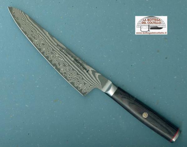 Modello Shotoh, più noto in Italia come coltello per verdure e frutta o spelucchino. Codice articolo: 34680-131. Lama da cm 14, con design damascato a 49 strati, cuore in acciaio FC 61. Impugnatura in pakkawood. Confezione: scatola di plastica e cartoncino. No lavastoviglie!
