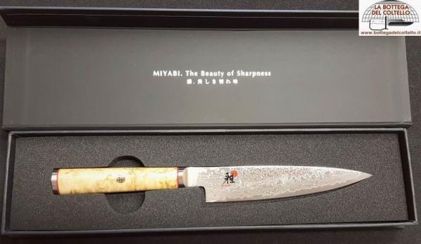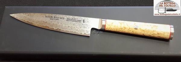Lama damasco inox 101 strati e impugnatura in legno di betulla caratterizzano questo coltello utility della serie Miyabi 5000MCD.