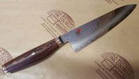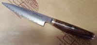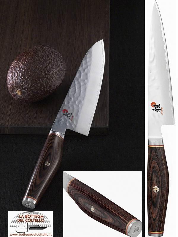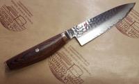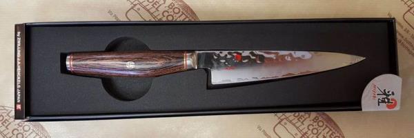 Art. 34072-131 Lama mm 130 in san-mai con cuore in acciaio da metallurgia delle polveri MC63 (Takefu SG2) HRC64. Trattamento termico Cryodur®. Affilatura simmetrica. La finitura martellata della lama (Tsuchime) , oltre a rendere il coltello attraente, contribuisce ad impedire che il cibo si attacchi durante il taglio. L'impugnatura è realizzata in pakkawood la cui bellezza è sottolineata dalla spinetta centrale decorata e dagli spaziatori in ottone e rossi. Terminale in acciaio inox con logo stampato a caldo. Confezione: scatola di plastica.