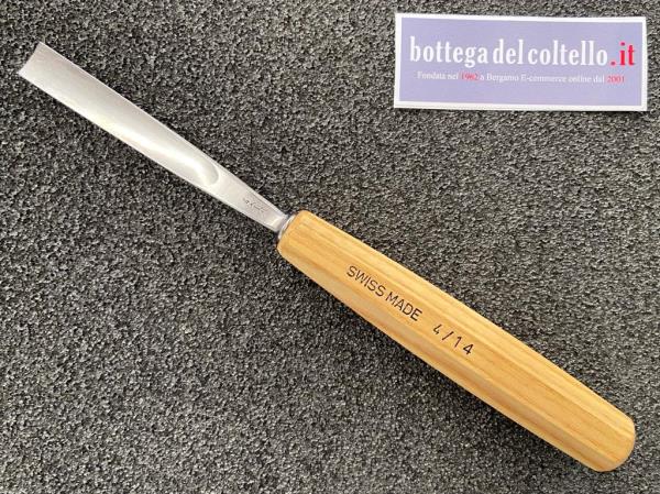 Dritto, sezione curva. Made in Switzerland. Utensile in acciaio non inossidabile, per la scultura e lavorazione del legno, temprato, con durezza finale tra i 59-61 RC, accuratamente affilato a mano e dotato di impugnatura in legno.