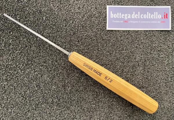 Pfeil sgorbia legno curvatura 6/2 mm: utensile professionale di dimensioni classiche, dritto, sezione curva, perfetto per sagomare nel legno rientranze e superfici sollevate, per esempio le pieghe dei tendaggi. Prodotto in Svizzera da Pfeil.