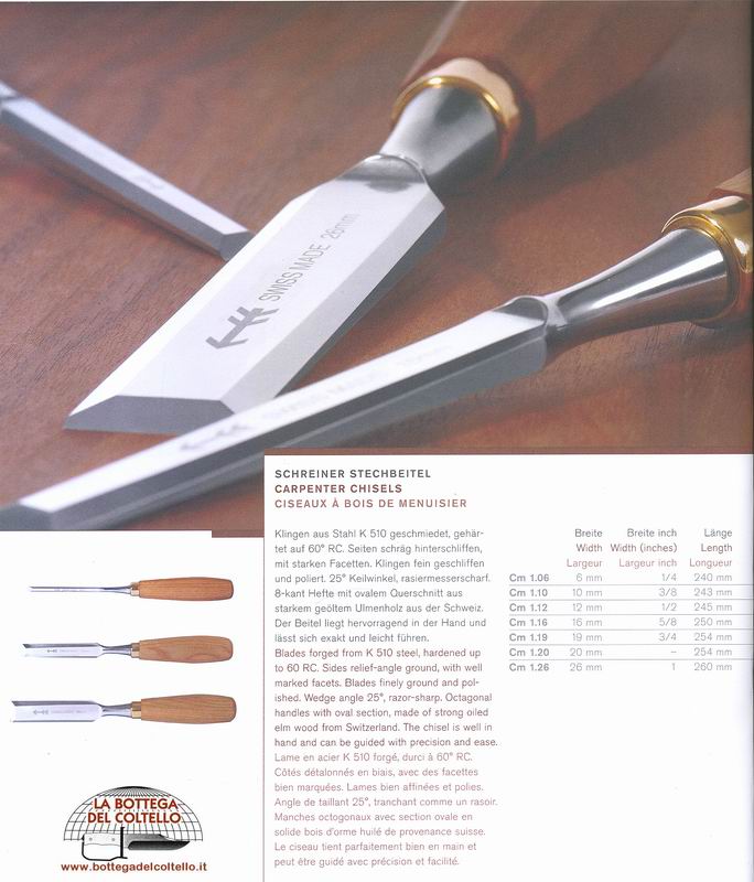 Affilato come un rasoio, angolo di taglio 25°. Impugnatura ottagonale con sezione ovale fatta con legno di olmo svizzero. Lunghezza mm 245, larghezza mm 12.