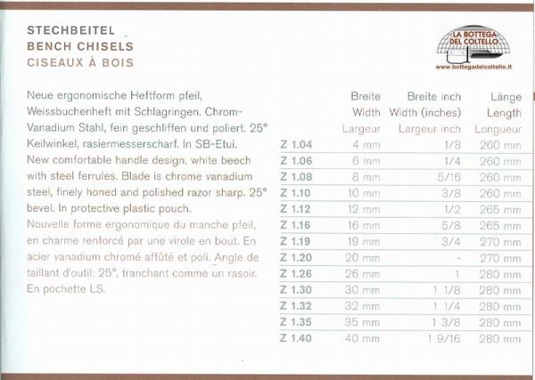 Pfeil Z 1.12 mm - Scalpello a taglio piano per lavorazione del legno. Acciaio non inossidabile al cromo vanadio, accurata affilatura, angolo di taglio di 25°. Lunghezza totale mm 265.