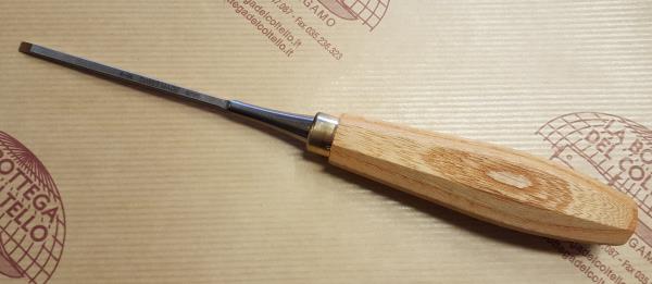 Pfeil Cm 1.04 - Scalpello per incisione e scultura del legno, perfettamente manovrabile, può essere guidato con precisione e facilità. Lama forgiata, HRC 60. Sfaccettatura ben marcata. Affilato come un rasoio, angolo di taglio 25°. Impugnatura ottagonale con sezione ovale fatta con legno di olmo svizzero. Lunghezza mm 240, larghezza mm 4.