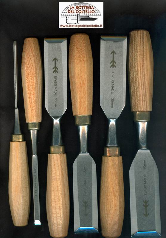 Affilato come un rasoio, angolo di taglio 25°. Impugnatura ottagonale con sezione ovale fatta con legno di olmo svizzero. Lunghezza mm 263, larghezza mm 32.