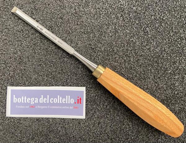 Pfeil Cm 1.08 - Scalpello per cesellatura e scultura del legno, perfettamente manovrabile, può essere guidato con precisione e facilità. Lama forgiata, HRC 60. Sfaccettatura ben marcata. Affilato come un rasoio, angolo di taglio 25°. Impugnatura ottagonale con sezione ovale fatta con legno di olmo svizzero. Lunghezza mm 242, larghezza mm 8.