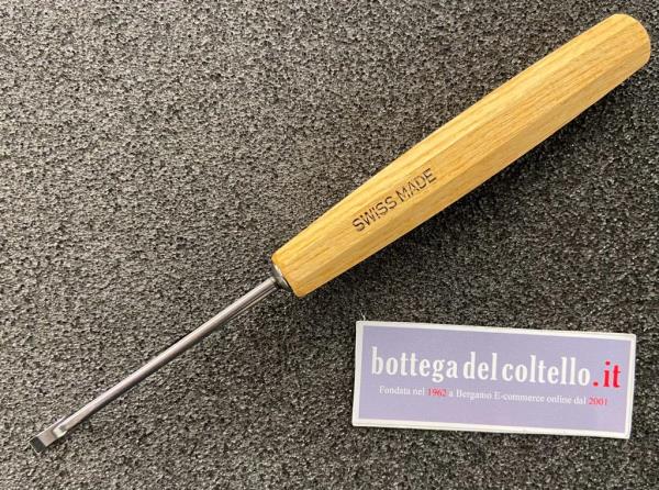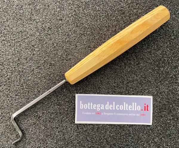 Utensile in acciaio non inossidabile, per la scultura e lavorazione del legno, temprato, con durezza finale tra i 59-61 RC, accuratamente affilato a mano e dotato di impugnatura in legno.
