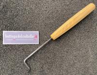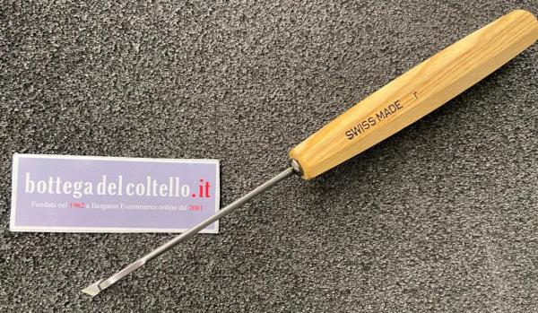 Utensile in acciaio non inossidabile, per la scultura e lavorazione del legno, temprato, con durezza finale tra i 59-61 RC, accuratamente affilato a mano e dotato di impugnatura in legno.