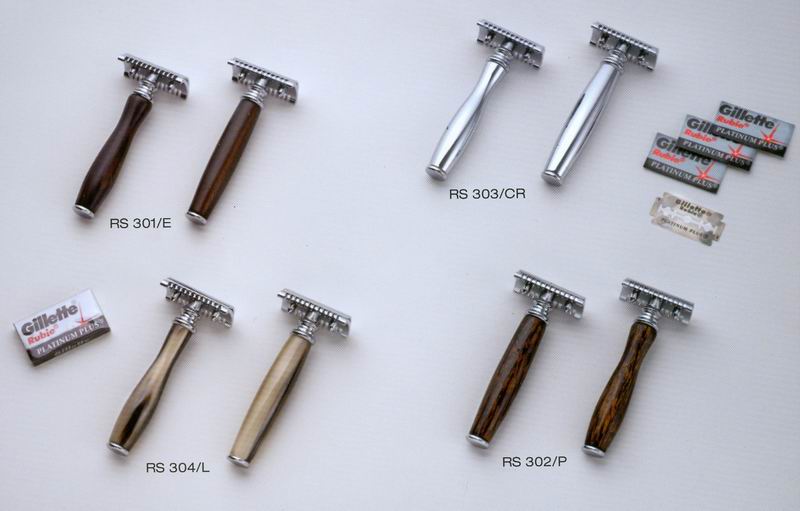 Toothed head. Chromed brass metal parts. Handle length: cm 10. 5 blades included. Packaging: gray cardboard box. The natural striations of the handle may be different from that reproduced on the image.