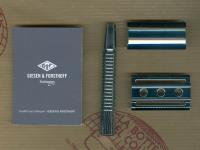 Art. #42094 Giesen & Forsthoff Solingen, Germany. Safety razor Timor, Chrome-plated, with interchangeable blades. Closed comb. Total length 90 mm, handle 80 mm. Comes with 5 blades. Packaging: cardboard box 19 x 7 cm.