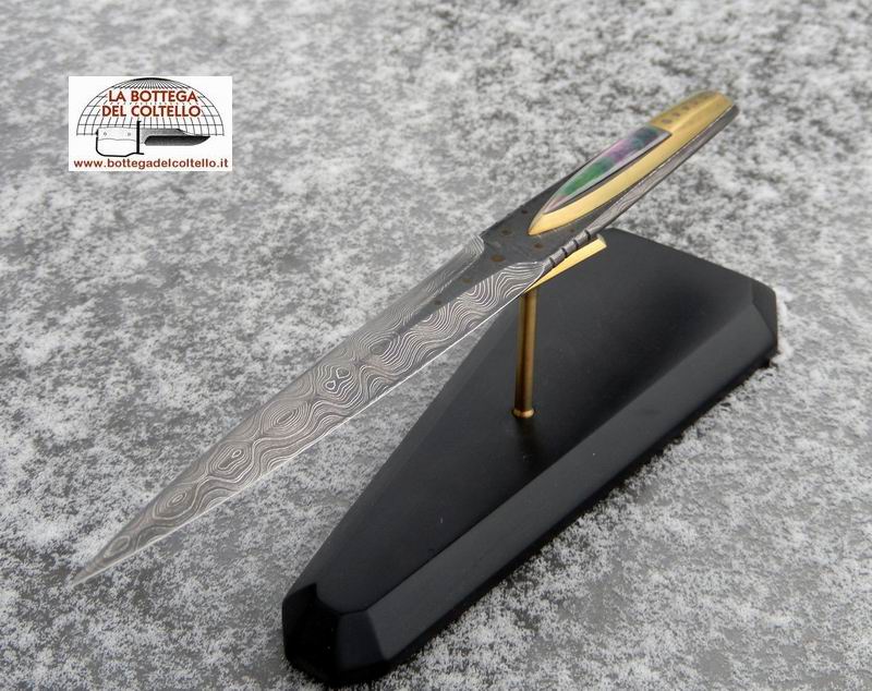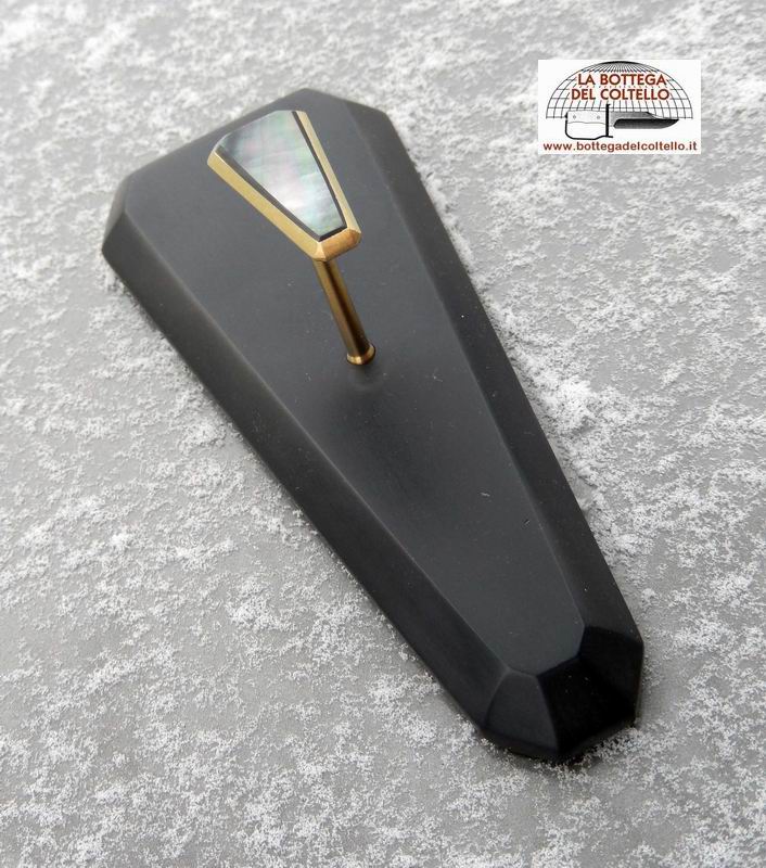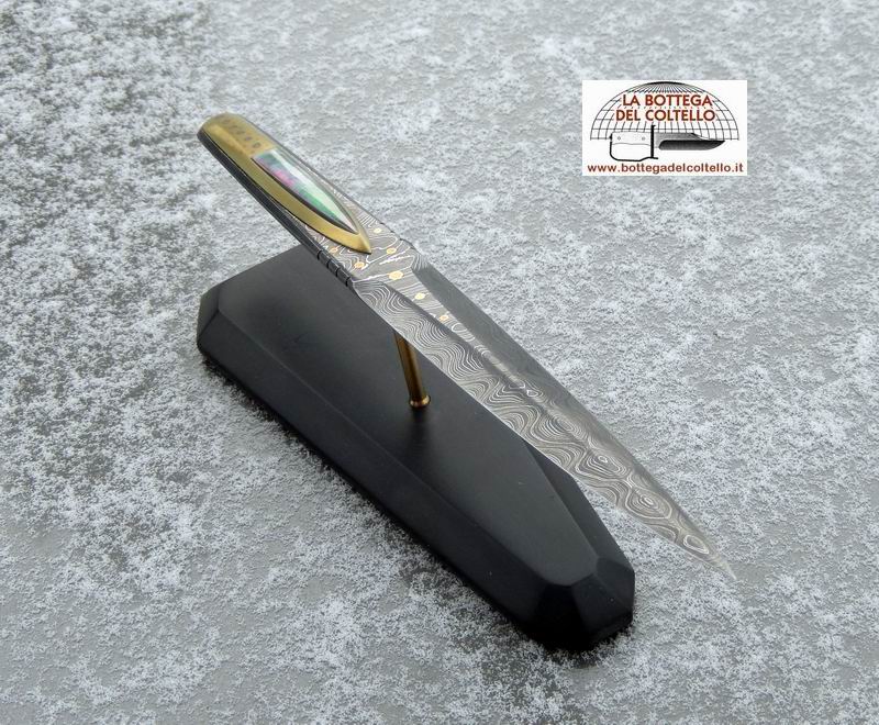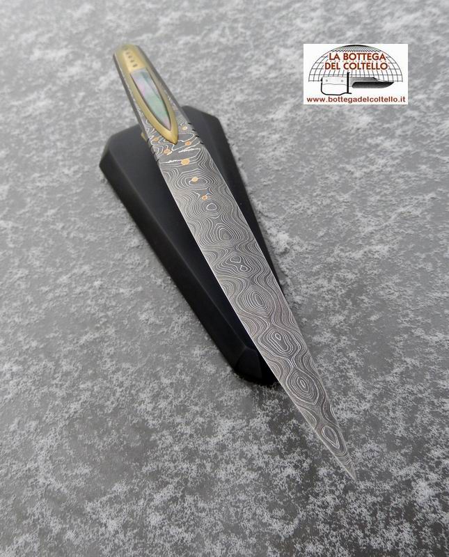 The blade is fashioned from an "Alabama rattler" damascus steel bar. Four different steels are used in the combination of 416 layers. The handle is a combination of titanium and black mother-of-pearl and is held to the blade using neodyum magnets inserted into the titanium. It comes with a polycarbonate base and a magnetic carrier made of titanium, topped with mother of pearl, in which are installed magnets that holds up the open-letter.