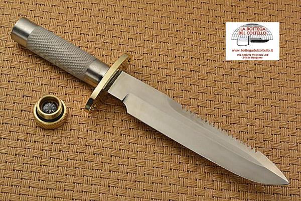 Stainless steel blade with sawteeeth. Brass hilt. Knurled hollow stainless steel handle. Removable threaded brass butt cap with O-ring seal. Brown leather sheath. Overall length mm 312, blade mm 191, weight (only knife) gr 450.