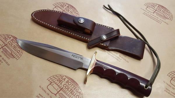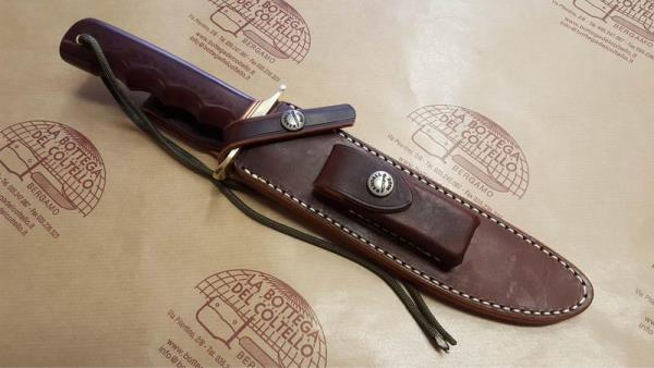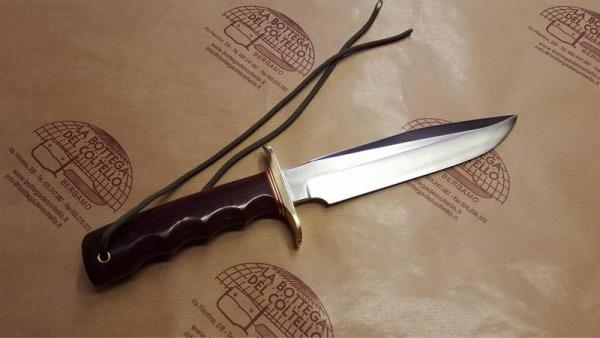 Randall model 1 - 7": micarta handle with finger grooves, stainless steel blade, brass finger guard, red and brass spacers. Overall length 297mm, blade length 177mm, cutting length 155mm, blade thickness 5,4 mm.