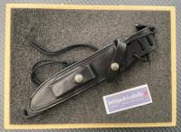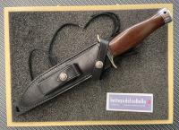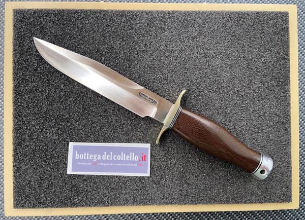 Blade stainless steel. Guard: nickel silver. Handle: brown micarta, Commando style, leather sheath with stone.