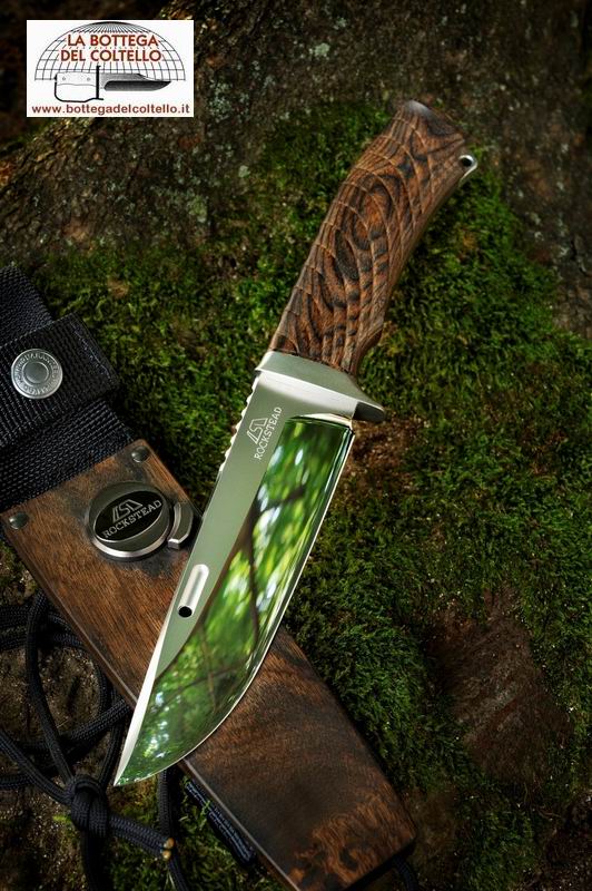 This knife is a practicable sheath knife. The shape of the blade is made from a consecutive convex surface. This is a technology that doesn't permit other follows, and Rockestead has confidence in this surface. When you strongly press this knife against the telephone book, it will cut like cutting butter. ZDP189 is a powder stainless steel material developed for cutlery. It is a product of the nano tech. Sharpness did not decrease so much to the blade of ZDP189 after having cut hard Manila rope 780 times. However, it is an unsuitable knife to the beating cut. This knife is full tang.