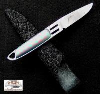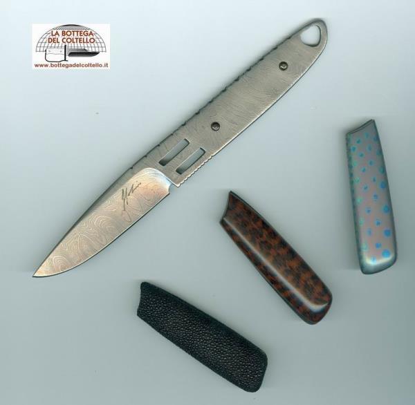 No stain damascus blade. Easy replaceable magnetic scales: titanium, snakewood and skin of ray. Skin of ray sheath.