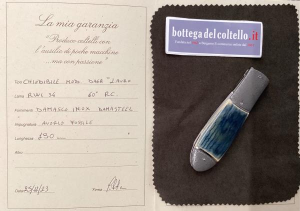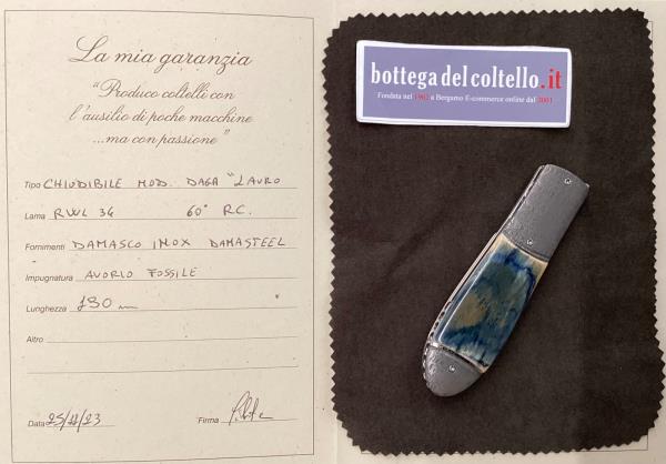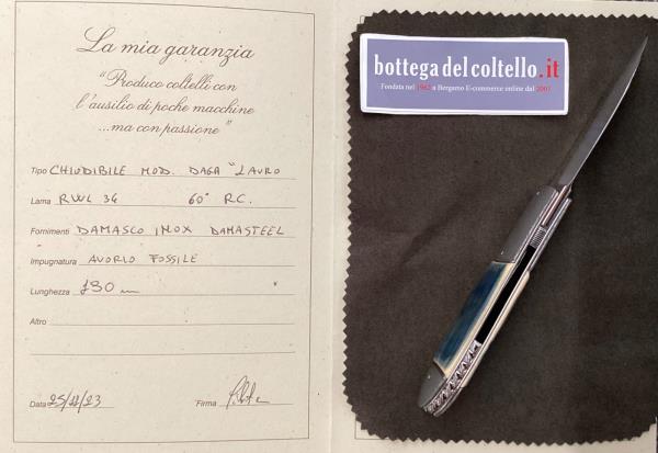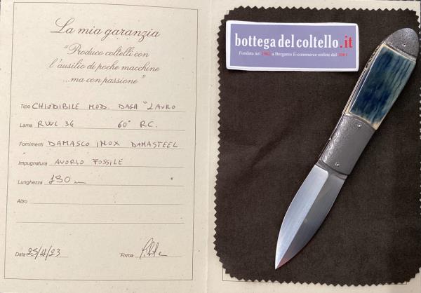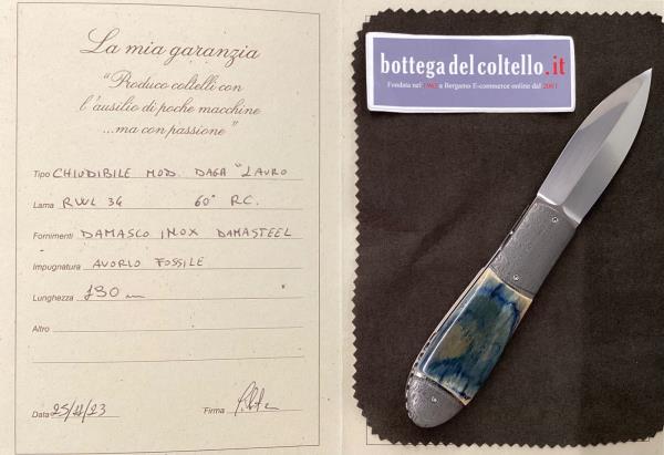 Compact and elegant folding dagger (with a single sharp cutting edge) by the famous cutler Fabrizio Silvestrelli.Blade made of RWL34 steel, handle scales in fossil ivory, with Damasteel stainless steel bolsters. Total length 190 mm