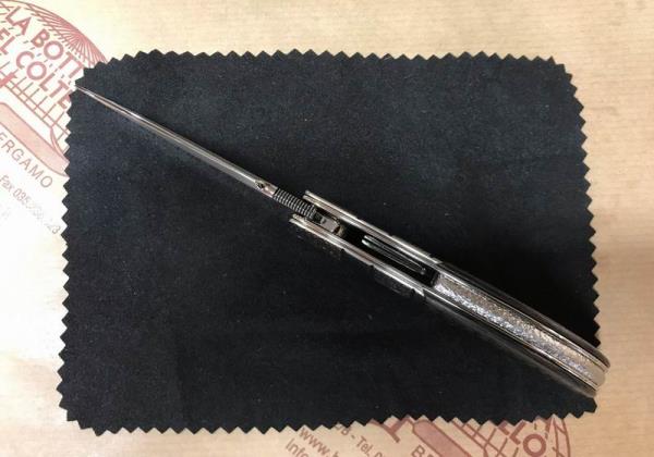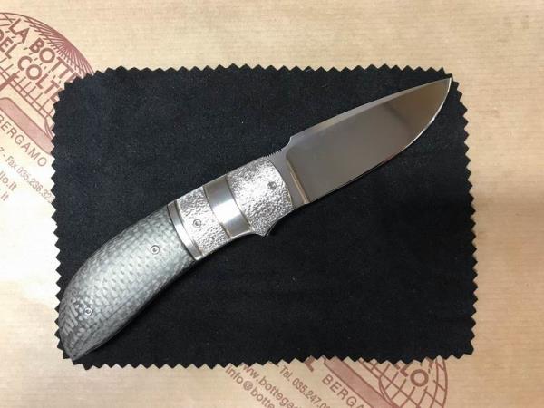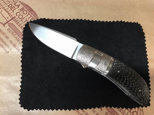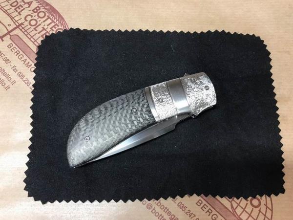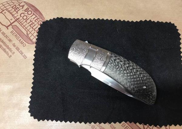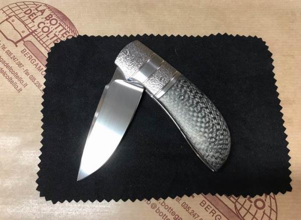 Gentleman Flipper Knife Made by the Italian knifemaker Fabrizio Silvestrelli, as known as Silvester. RWL 34, 60° RC. Blade. Titan Gr. 1 Fine finishes. Carbon fiber handle. Total length 172mm.