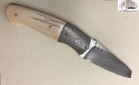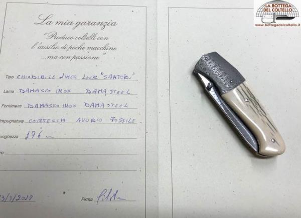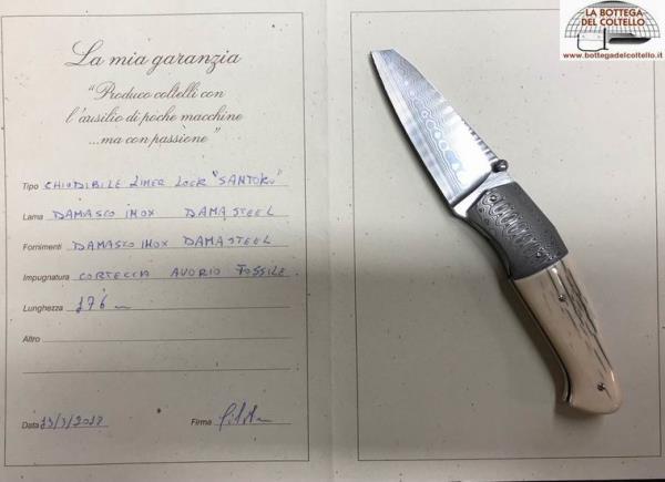 Santoku model liner lock folding knife. Stainless damask damasteel. Fossil ivory bark. Total length 176 mm.