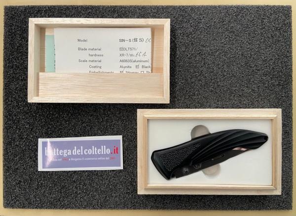 Features provided by the manufacturer: registration number F-SSD002 SIN model number 002 steel blade YXR-7 with hardness HRc 65.4 partially coated with DLT with aluminum handle A6063S, coated with black Alumite / Hv400 ray leather insert, equipped with clip. "SHIN" in Japanese means "trust".