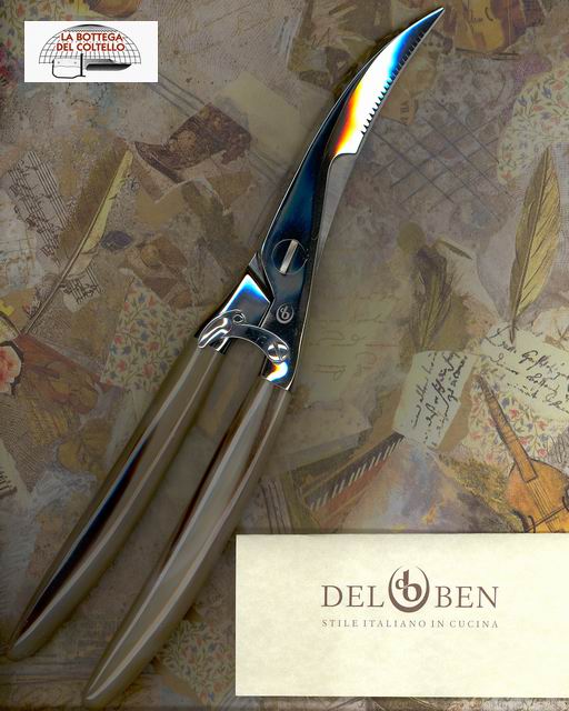 Stainless steel poultry shears with horn handle. Overall length cm 28. Made in Italy.