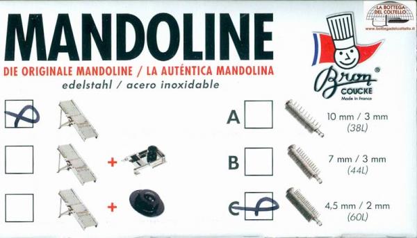 Size of this professional vegetable slicer closed: 405 x 112 x 40 mm. 60 blades, 4,5 mm / 2 mm. Delivedered in decorated cardboard box. Accessories sold separately. Bron-Coucke is a French family Company based in Haute-Savoie, manufacturing kitchen mandolins for over 50 years.