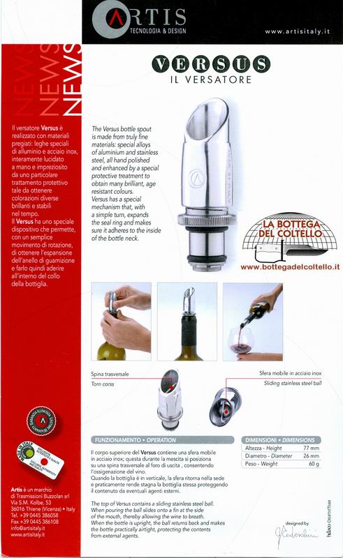 ... STAINLESS STEEL, ALL HAND POLISHED AND ENHANCED BY A SPECIAL PROTECTIVE TREATMENT TO OBTAIN MANY BRILLIANT, AGE RESISTANT COLOURS. Versus has a special mechanism that, with a simple turn, expands the seal ring and makes sure it adheres to the inside of the bottle neck. The top of Versus contains a sliding stainless steel ball. When pouring the ball slides onto a fin at the side of the mouth, thereby allowing the wine to breath. When the bottle is upright, the ball returns back and makes the bottle practically airtight, protecting the contents from external agents. Dimensions: height mm 77, diameter mm 26, weight gr 60.