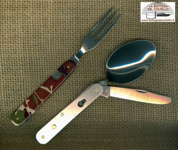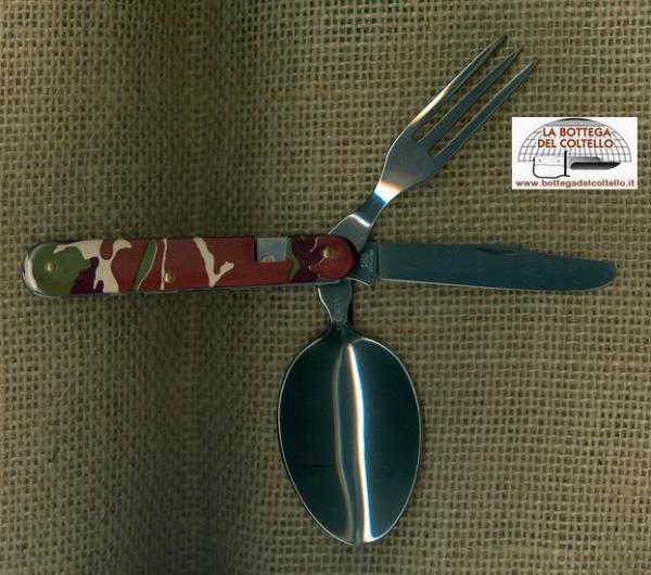 Compact folding & divisible stainless steel three implements and liners camping table ware: fork, spoon and knife. Camouflage sublimated “Anticorodal” light aluminium alloy handle. It’s complete with the green sheath. Made in Italy by Mercury. All what you need in a small space always at hand in your knapsack during your walks through the nature.