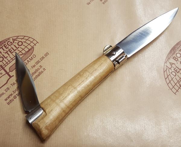 Shepherd style knife with two blades.: the longer is made of stainless steeel, 9cm length, and has a locking ring; the smaller blade is made of carbon steel. Chestnut wood handle. The color tones of the handle may be different from that reproduced on the image.