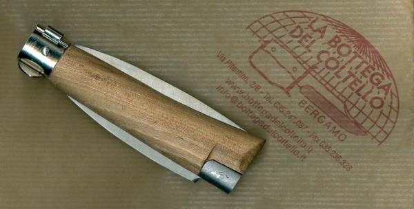 Shepherd style knife with two blades.: the longer is made of stainless steeel, 9cm length, and has a locking ring; the smaller blade is made of carbon steel. Walnut handle. The natural striations of the handle may be different from that reproduced on the image. The possible working imperfections or inaccuracies are understandable consequences of the economical rustic and traditional elaboration.
