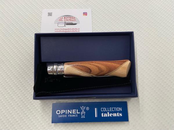 Opinel France. Pocket folding knife n. 08 with mirror finish stainless steel blade. Handle produced by Bruno Chaperon Marquetry using an exclusive, patented method of assembly of wood species. Each handle is unique through the species chosen, the cut and the shaping. The handle is buffed (polished by hand with cotton felt). Dimensions: total length 190 mm, blade 80 mm, closed 110 mm. Virobloc system. Packing: cardboard box.