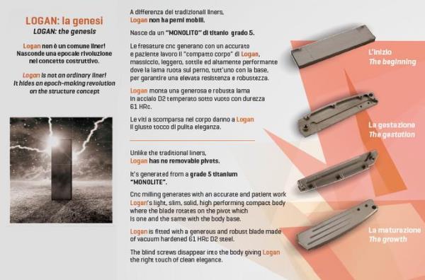 Logan non è un normale liner!, nasconde una rivoluzione epocale nel concetto di struttura. A differenza delle fodere tradizionali, Logan non ha perni rimovibili. È generato da un titanio grado 5 “MONOLITE”. La fresatura CNC genera con un lavoro accurato e paziente il corpo compatto leggero, solido e performante di Logan dove la lama ruota sul perno che è tutt'uno con la base del corpo. Le viti cieche scompaiono nel corpo donando a Logan il giusto tocco di pulita eleganza.