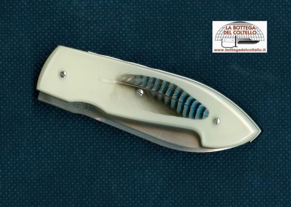 12C27 stainless steel blade. Synthetic scales with two jay feathers. Overall length 165 mm, blade mm 70, closed 95. Cardboard box.