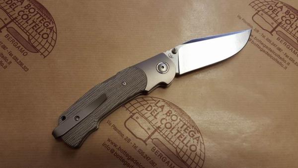 Blade: Böhler M390 MICROCLEAN sintered hardened stainless steel; cryogenic treatments; hardness 59/61 HRC; thickness 4 mm; satin finish. Locking mechanism: advanced back- lock. Liners and Bolsters: titanium single piece. Backspacer: stainless steel. Scales: green Canvas Micarta®. Rotation mechanism: thrust bearings. Clip: shaped titanium. Package: cardboard box with logo. Dimensions: open knife total length 188mm, blade length 82mm. Weight 125gr.