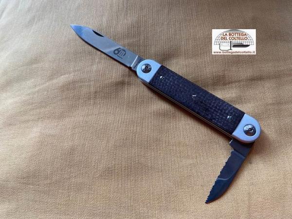 Maserin item 195/MCM folding knife with a main blade and a smaller serrated blade; it's very light and practical to carry with its sheath E.D.C. Specifications: Handle: BROWN micarta - Blade: AISI 420, HRC 56, 60 mm - Blade Thickness: 2.2 mm - Overall length: 195 mm - Weight: 38 gr. - Bolsters: Anodized alluminum - Packaging: black cardboard box.