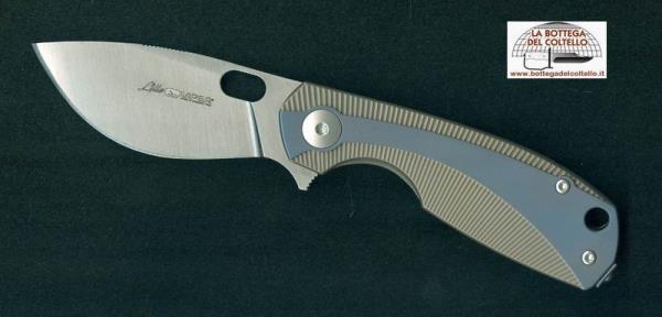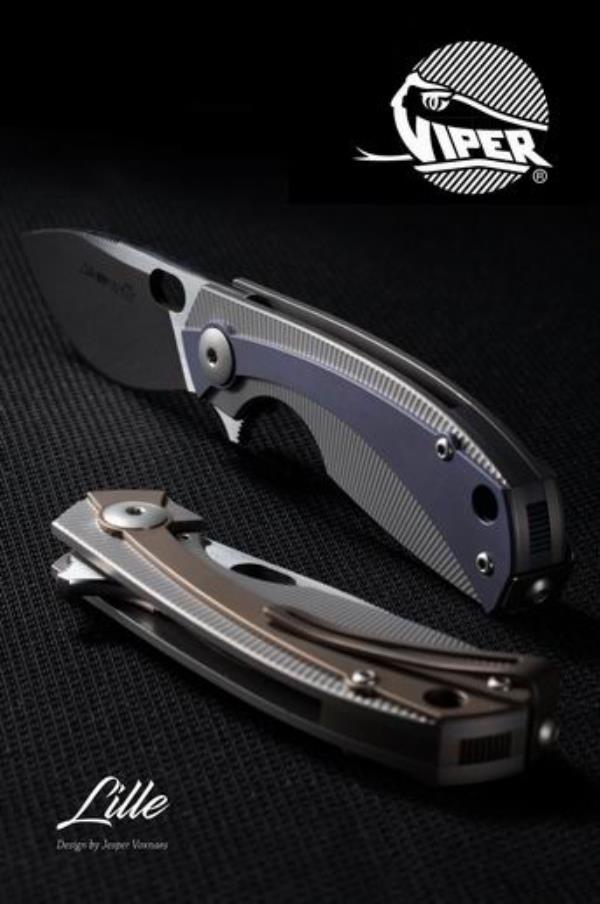 Viper, Lille series - Satin blade folding knife with with titanium bronze anodized liner and titanium blue anodized handle overlay. Jesper Voxnaes design.