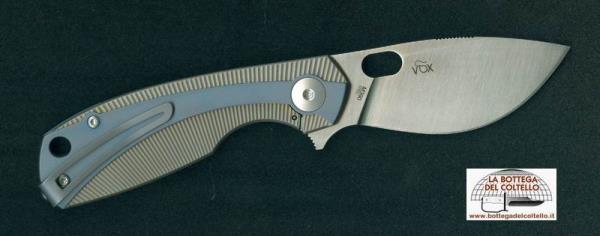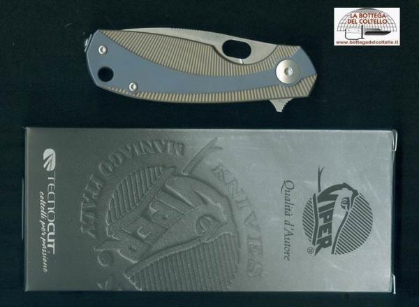 Viper Tecnocut Italy Cod. V5962BRBL Folding knife - Blade: Bohler M390 Microclean stainless steel; vacuum, double temper and cryogen treatments; hardness HRC 60/61; thickness 3mm; satin finish. Locking mechanism: liner lock. Liner lock: titanium GR5, thickness 2,5 mm; CNC machining; bead blasted finish. Liner: titanium GR2; thickness 2,5 mm; CNC machining. Spacer: titanium GR2, CNC machining. Handle overlay: titanium GR5; thickness 1 mm. Clip: titanium GR5 (Ti6AI4V). Screws: AISI 303/304 steel. Rotation mechanism: thrust bearings. Dimensions: total length 157mm, blade 63 mm, weight 83 gr. total Package: cardboard box with logo.