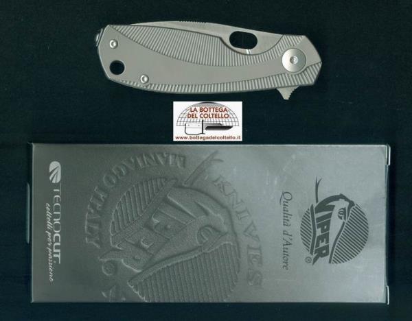 Viper Tecnocut Italy Cod. V5962TITI Folding knife - Blade: Bohler M390 Microclean stainless steel; vacuum, double temper and cryogen treatments; hardness HRC 60/61; thickness 3mm; satin finish. Locking mechanism: liner lock. Liner lock: titanium GR5, thickness 2,5 mm; CNC machining; bead blasted finish. Liner: titanium GR2; thickness 2,5 mm; CNC machining. Spacer: titanium GR2, CNC machining. Handle overlay: titanium GR5; thickness 1 mm. Clip: titanium GR5 (Ti6AI4V). Screws: AISI 303/304 steel. Rotation mechanism: thrust bearings. Dimensions: total length 157mm, blade 63 mm, weight 83 gr. total Package: cardboard box with logo.