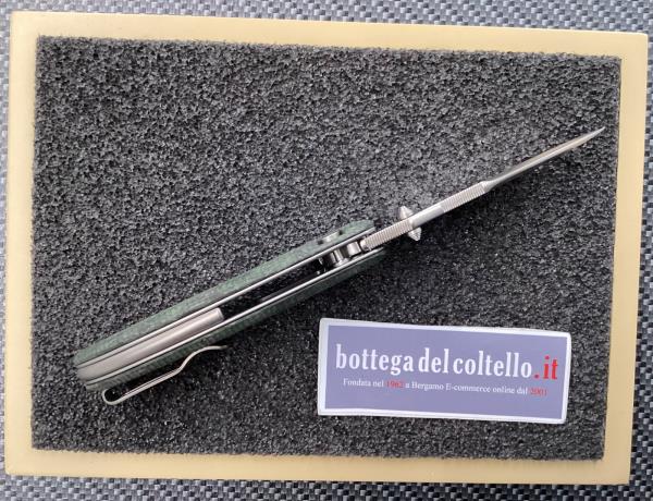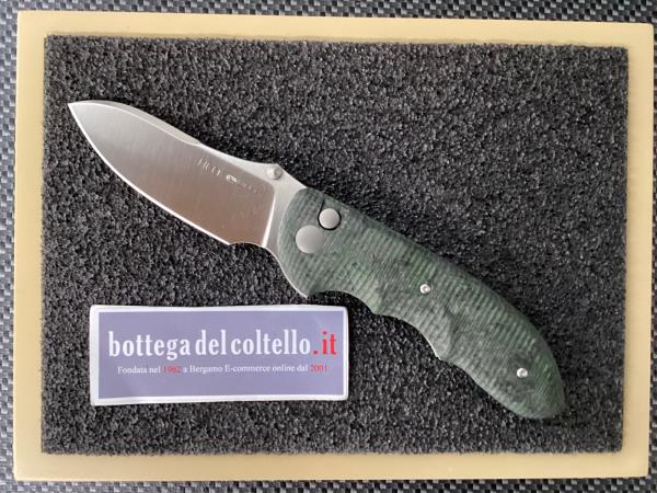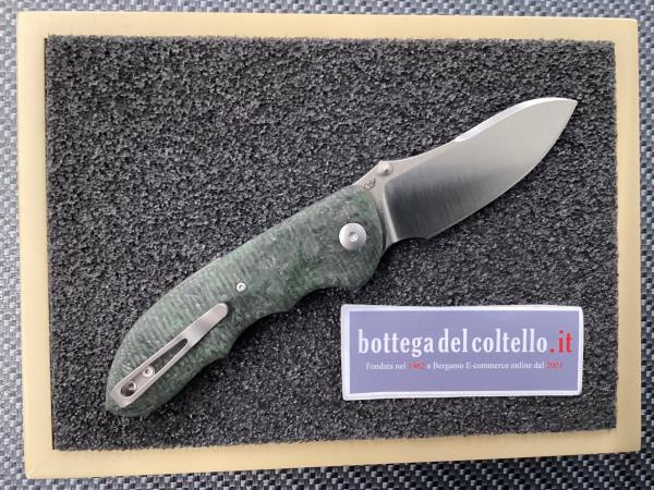 Button lock folding knife. 4mm MagnaCut steel blade with stonewashed finish. Carbon fiber green dark matter handle and titanium clip. Titanium backspacer.