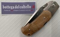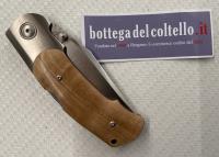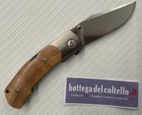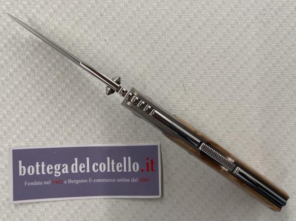 Blade: Böhler M390 MICROCLEAN sintered hardened stainless steel; cryogenic treatments; hardness 59/61 HRC; thickness 4 mm; satin finish. Locking mechanism: advanced back- lock. Liners and Bolsters: titanium single piece. Backspacer: stainless steel. Scales: flamed poplar wood. The handle can have shades and natural streaks different from that reproduced on the image. Rotation mechanism: thrust bearings. Package: cardboard box with logo. Leather pouch. Dimensions: open knife total length 188mm, blade length 82mm. Weight 125gr.