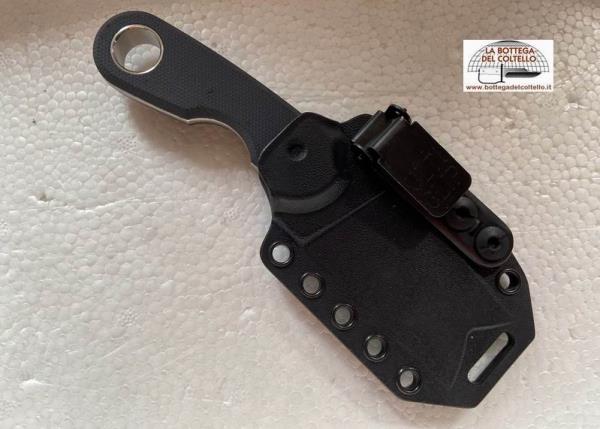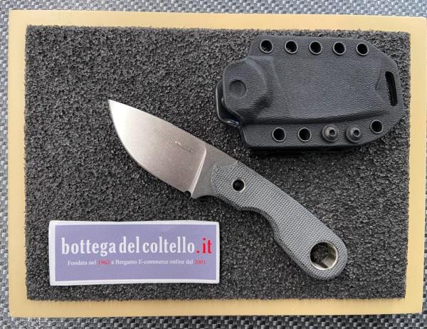 Blade: Böhler M390 sintered hardened stainless steel; cryogenic treatments; hardness HRC 59/61; thickness 4 mm; stone washed . Handle: BLACK Canvas Micarta® with AISI 303 steel locking ring. The handle is the result of a careful ergonomic study: despite its compact size, the Berus handle has a firm and secure grip; a checkering on the back of the blade ensures precise control of the cutting direction. The Kydex sheath has Ulticlip, a very practical clip to attach it to the pocket or on the trouser belt. In addition, Berus kydex sheath is compatible with Tek-Lok system and it can be worn on the neck. Packaging: reinforced cardboard box with logo. Weight 95gr, total length 154mm, blade length 67mm.