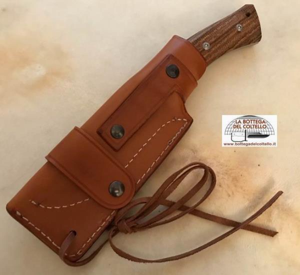 Blade: Böhler N690Co stainless steel, vacuum heat treatment and cryogenic heat treatment; hardness HRC 58/60; finished thickness blade 4 mm; satin finishing. Handle: fine natural bocote wood. Sheath: fine leather. Packaging: reinforced cardboard box with logo. Blade length 115 mm, 4½"; total length 248mm, 9¾; weight 240 gr, 8.46oz. The shade and the natural streaks of the wood can be different from that reproduced on the image.