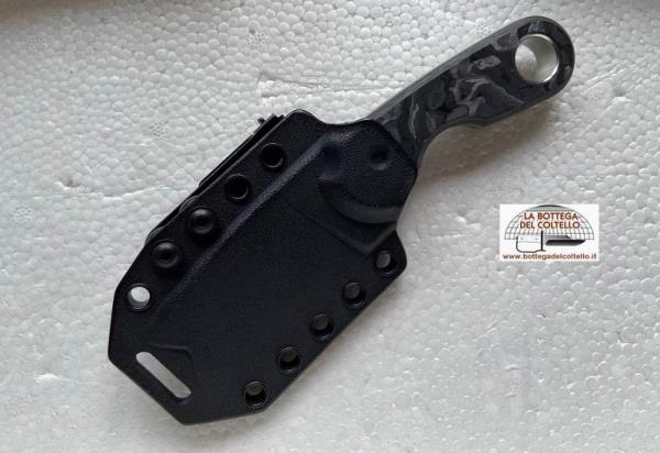 Blade: Böhler M390 sintered hardened stainless steel; cryogenic treatments; hardness HRC 59/61; thickness 4 mm; satin finish. Handle: MARBLED carbon fiber with AISI 303 steel locking ring. The handle is the result of a careful ergonomic study: despite its compact size, the Berus handle has a firm and secure grip; a checkering on the back of the blade ensures precise control of the cutting direction. The Kydex sheath has Ulticlip, a very practical clip to attach it to the pocket or on the trouser belt. In addition, Berus kydex sheath is compatible with Tek-Lok system and it can be worn on the neck. Packaging: reinforced cardboard box with logo. Weight 95gr, total length 154mm, blade length 67mm.