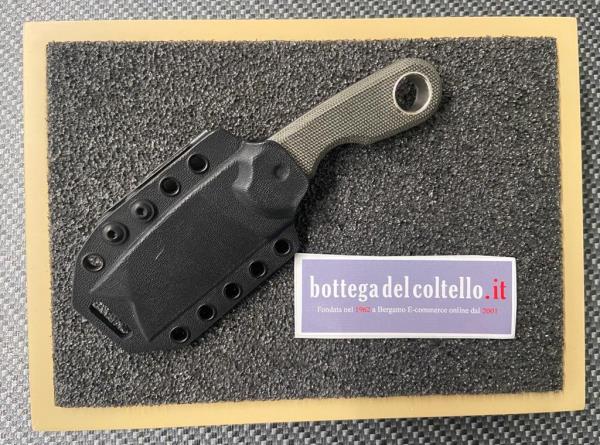 Blade: Böhler M390 sintered hardened stainless steel; cryogenic treatments; hardness HRC 59/61; thickness 4 mm; stone washed. Handle: black Canvas Micarta® with AISI 303 steel locking ring. The handle is the result of a careful ergonomic study: despite its compact size, the Berus handle has a firm and secure grip; a checkering on the back of the blade ensures precise control of the cutting direction. The Kydex sheath has Ulticlip, a very practical clip to attach it to the pocket or on the trouser belt. In addition, Berus kydex sheath is compatible with Tek-Lok system and it can be worn on the neck. Packaging: reinforced cardboard box with logo. Weight 95 gr, total length 154 mm, blade length 62 mm.