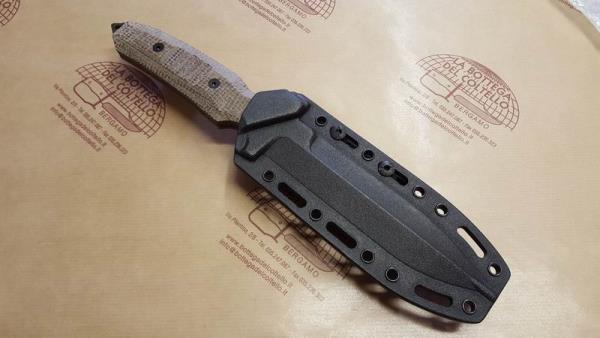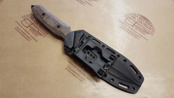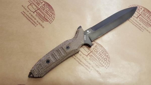 Blade: Sleipner stainless steel, heat treatment, hardness HRC 59/61; finished thickness blade 6 mm; DLC coated. Handle: Brown Burlap Micarta. Sheath: Kydex Sheath with Tek-lock. Packaging: reinforced cardboard box with logo. Dimensions: total length 296 mm – 11 2/3”; blade length 152 mm – 6. Weight 260 gr – oz.9.18.