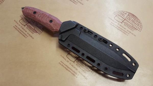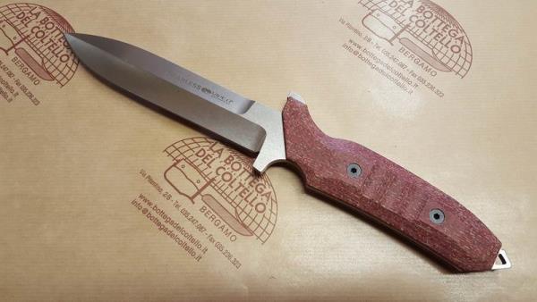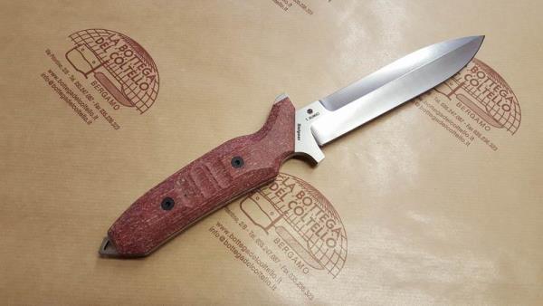 Blade: Sleipner stainless steel, heat treatment, hardness HRC 59/61; finished thickness blade 6 mm; Stone Washed. Handle: Red Burlap Micarta . Sheath: Kydex Sheath with Tek-lock. Packaging: reinforced cardboard box with logo. Dimensions: total length 296 mm – 11 2/3”; blade length 152 mm – 6. Weight 260 gr – oz.9.18.
