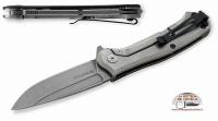 Experienced as a soldier in war fields, Nicolai Lilin, a well known writer, has designed this knife that is strong and reliable thanks to the thickness of the blade and to the material of the handle, black G10. This 680/G10N POLICE knife has: N690 stainless steel blade, stonewashed finishing; overall length 230 mm, blade length 110 mm; titanium handle, black G10 scales; steel clip; opener system: Flipper with bearing. Black sheath. Packaging: black cardboard box.